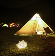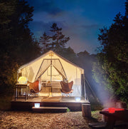 QWNN lantern illuminating interior of glamping tent with warm ambient light